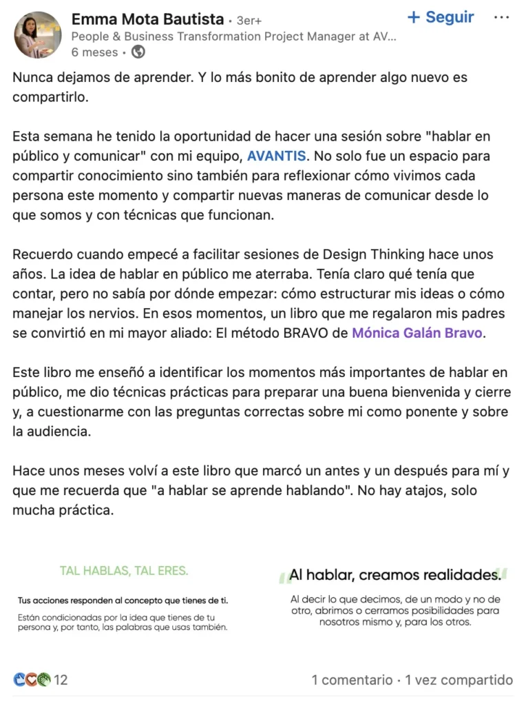 Recuerdo cuando empecé a facilitar sesiones de Design Thinking hace unos años. La idea de hablar en público me aterraba. Tenía claro qué tenía que contar, pero no sabía por dónde empezar: cómo estructurar mis ideas o cómo manejar los nervios. En esos momentos, un libro que me regalaron mis padres se convirtió en mi mayor aliado: El método Bravo de Mónica Galán Bravo.